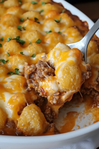 Layers of ground beef, creamy mushroom soup, vegetables, cheese, and crispy tater tots baked together in one casserole. Easy, satisfying, family‑friendly!